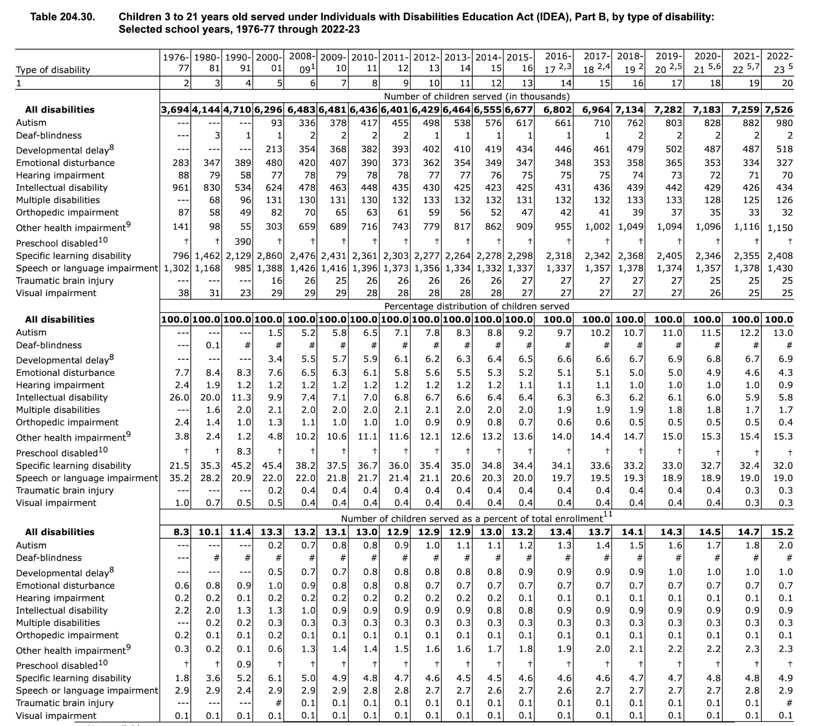 The impact of legislation to secure the rights and responsibilities of students with disabilities is evidenced in Table 204.30. The total number of students served more than doubled between 1977 and 2023.